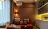 В зоне гостиной расположены: удобный угловой диван с диванными подушками, журнальный столик. Здесь Вы можете отдохнуть после рабочего дня. При необходимости, диван разбирается, накрывается топпером и образует дополнительное спальное место 120х200 см.